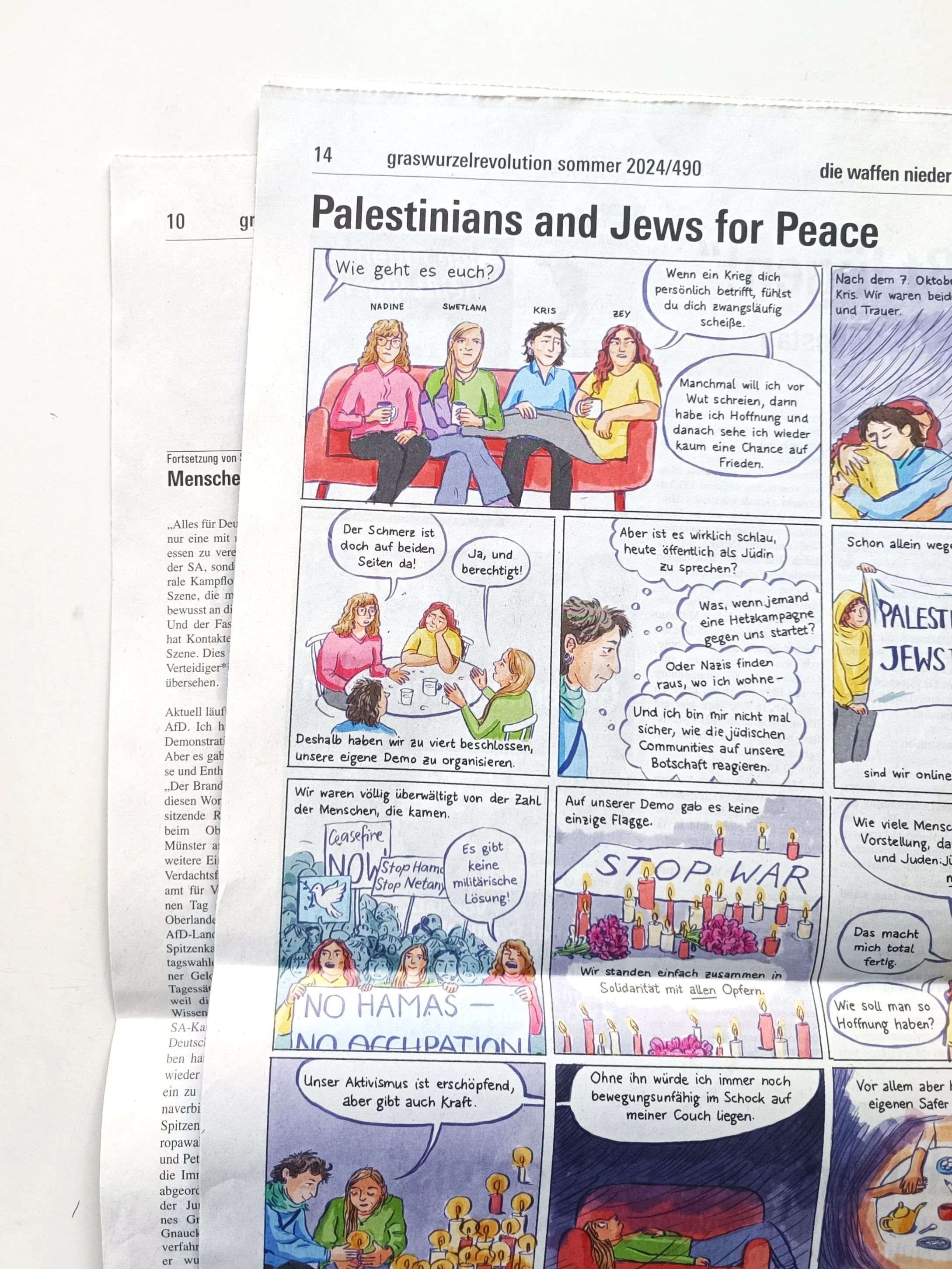Für meinen Comic habe ich die Mitgründer*innen von Palestinians & Jews for Peace interviewt - Kristina Bublevskaya, Zeynep Karaosman, Swetlana Nowoshenowa und Nadine Migesel. Eine ist Jüdin aus Russland, eine Palästinenserin und Syrerin, geboren und aufgewachsen in der Türkei, eine Jüdin mit ukrainischen Wurzeln und eine halb Palästinenserin aus einer christlich-arabischen Familie, halb Deutsche mit israelischem Pass. Sie setzen sich für einen differenzierten Dialog und einen mitfühlenden und respektvollen Umgang miteinander ein. „Wir suchen das Gespräch miteinander und mit anderen, um uns zusammen für eine friedliche, diskriminierungskritische Gesellschaft einzusetzen.“